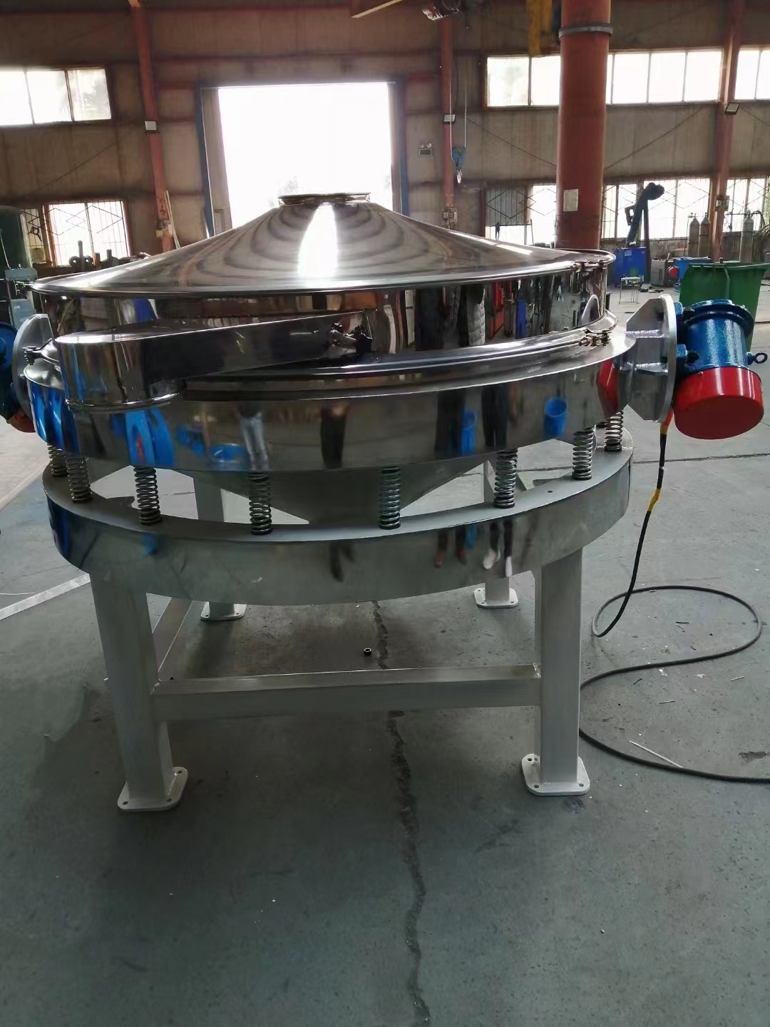 面粉直排篩上安裝的振動電機利用其軸上下端的兩組偏心塊的相位角以及兩臺電機之間的交叉角度將振動電機的旋轉(zhuǎn)運動變?yōu)樗?、垂直、傾斜以及離心作用的多作用力重疊,再將這種作用力傳遞至篩面,達(dá)到篩分的目的,改變上下偏心塊的相位角和重量,可以改變激振力的大上和物料的運動軌跡。面粉直排篩的篩下物出料口采用直泄式結(jié)構(gòu),以此提高了排料速度和排料量,更適合物料除雜等粗略篩分等工藝。